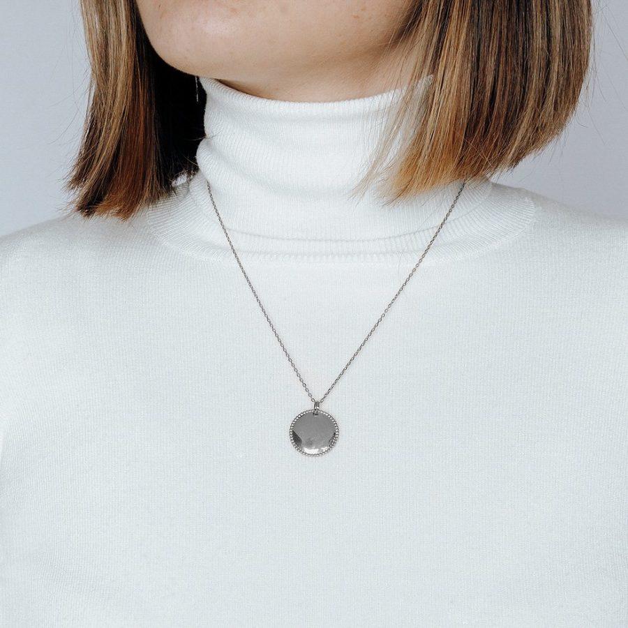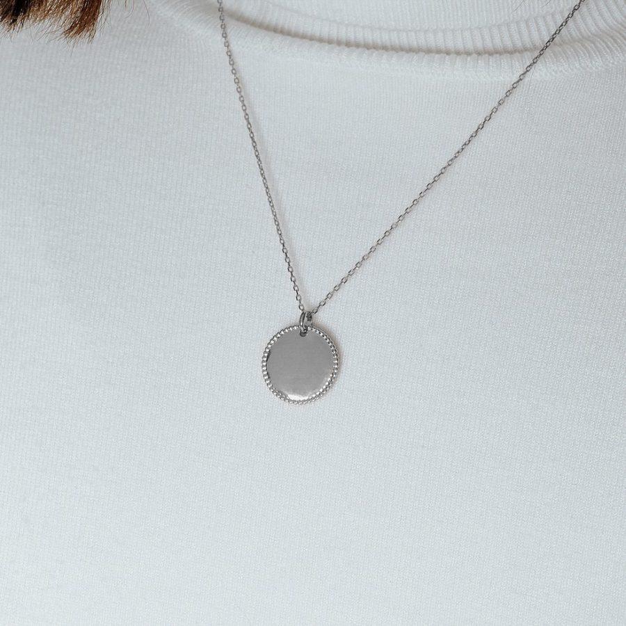 Colgante para chicas que puedes personalizar con tu propio grabado por ambas caras. Este collar de plata maciza tiene un detalle punteado por ambas caras en el borde de la medalla.